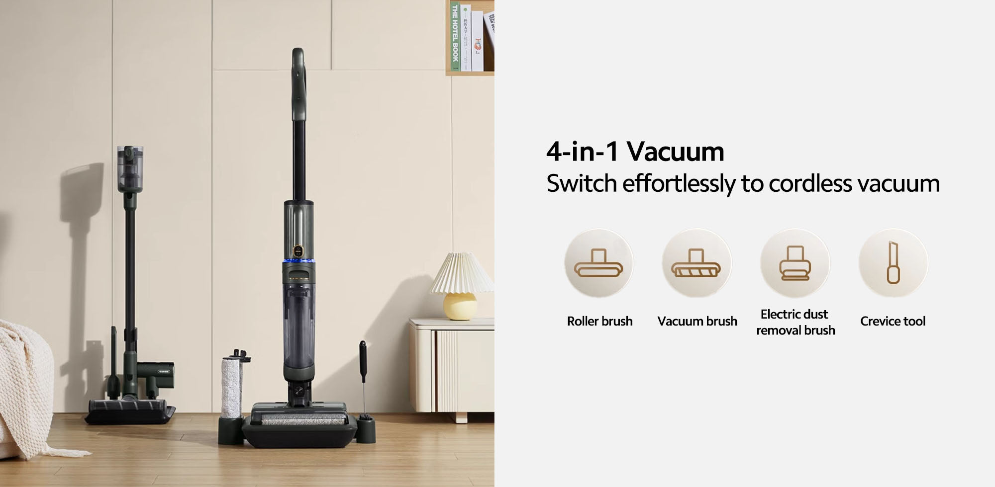 Experience powerful cleaning with the Q09-Max. Easily handle spills, dust, and debris with ease. With strong suction power and sterilisation function, making deep cleaning effortless. Switch to cordless vacuum for quick and light clean-ups.