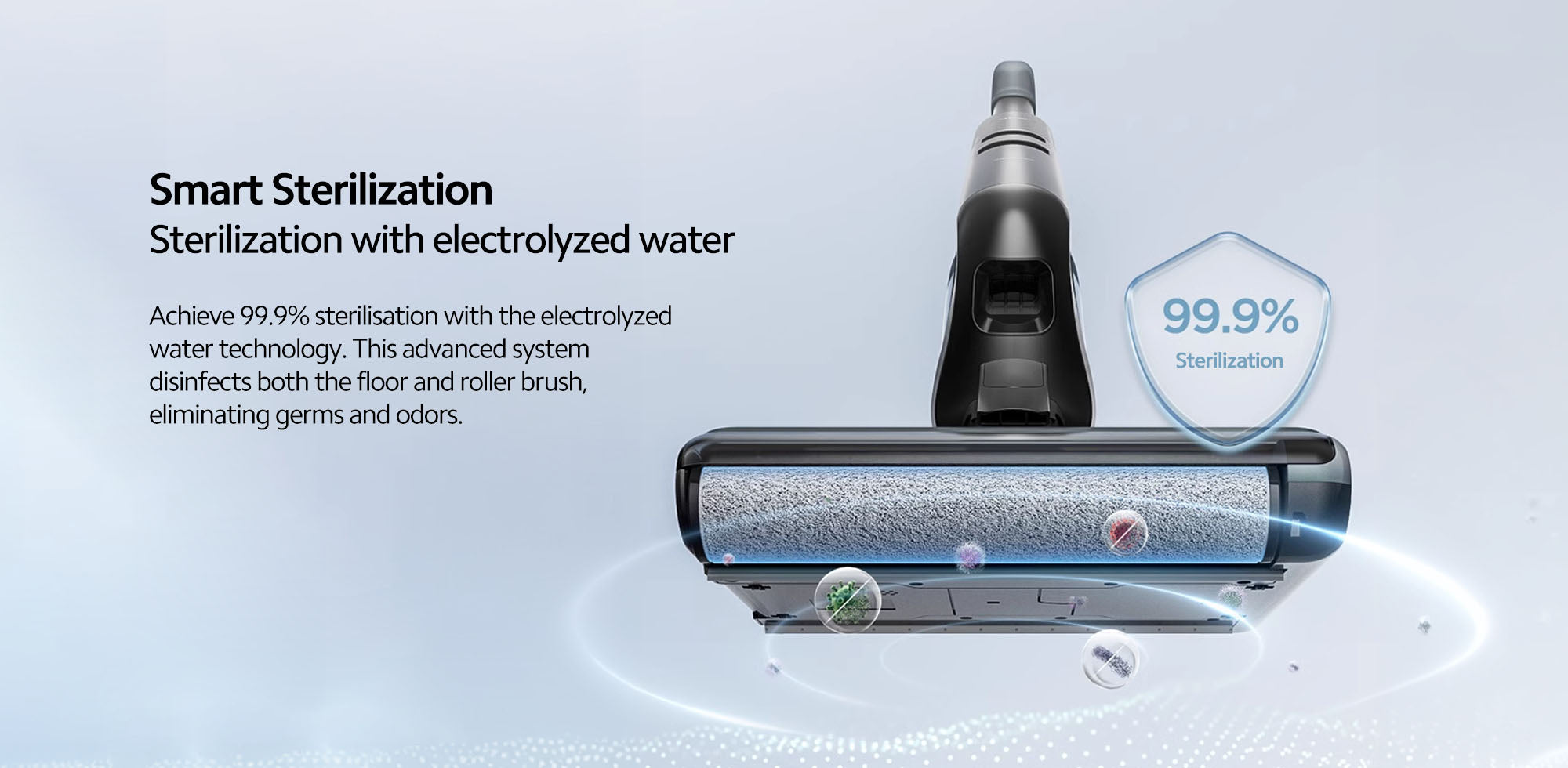 Electrolyzed Water Sterilization – Generates electrolyzed water during the cleaning process, effectively sterilizing your floors by neutralizing bacteria and germs.