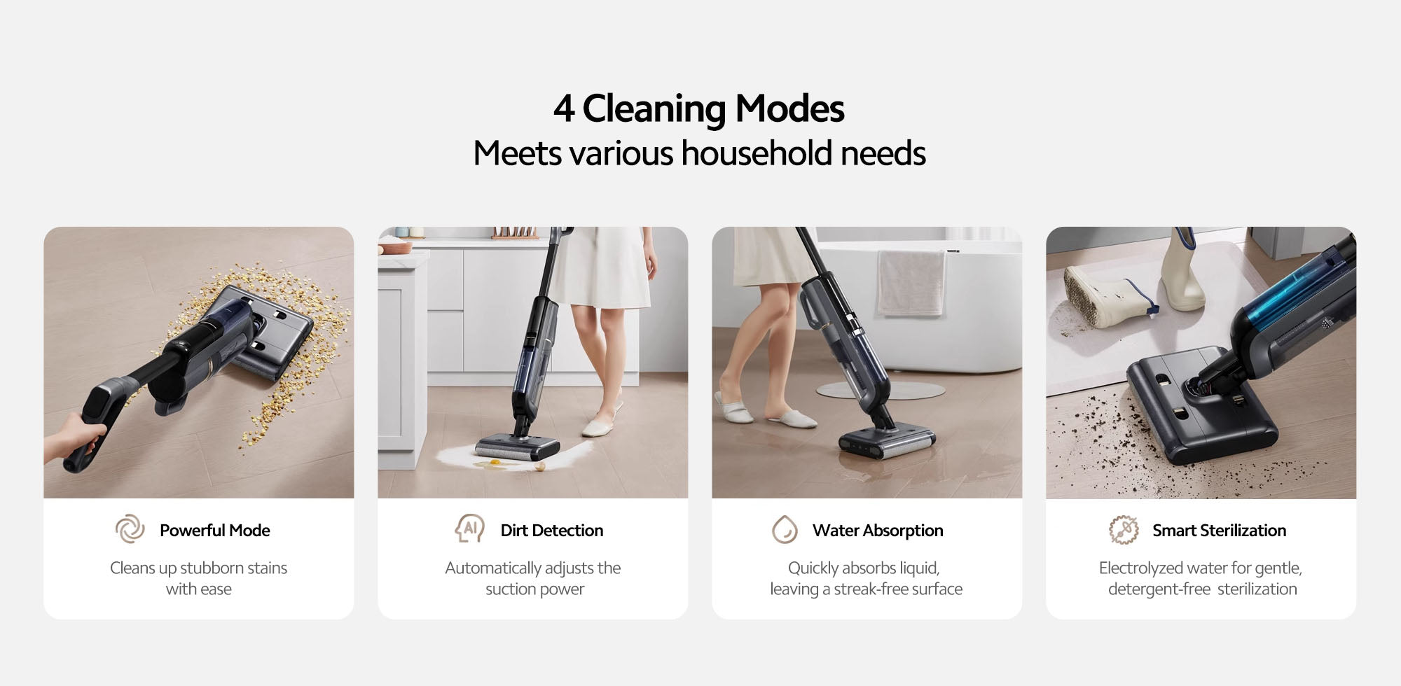 | Suction Level: | 4 modes – Powerful, Dirt Detection, Water Absorption & Smart Sterilisation |