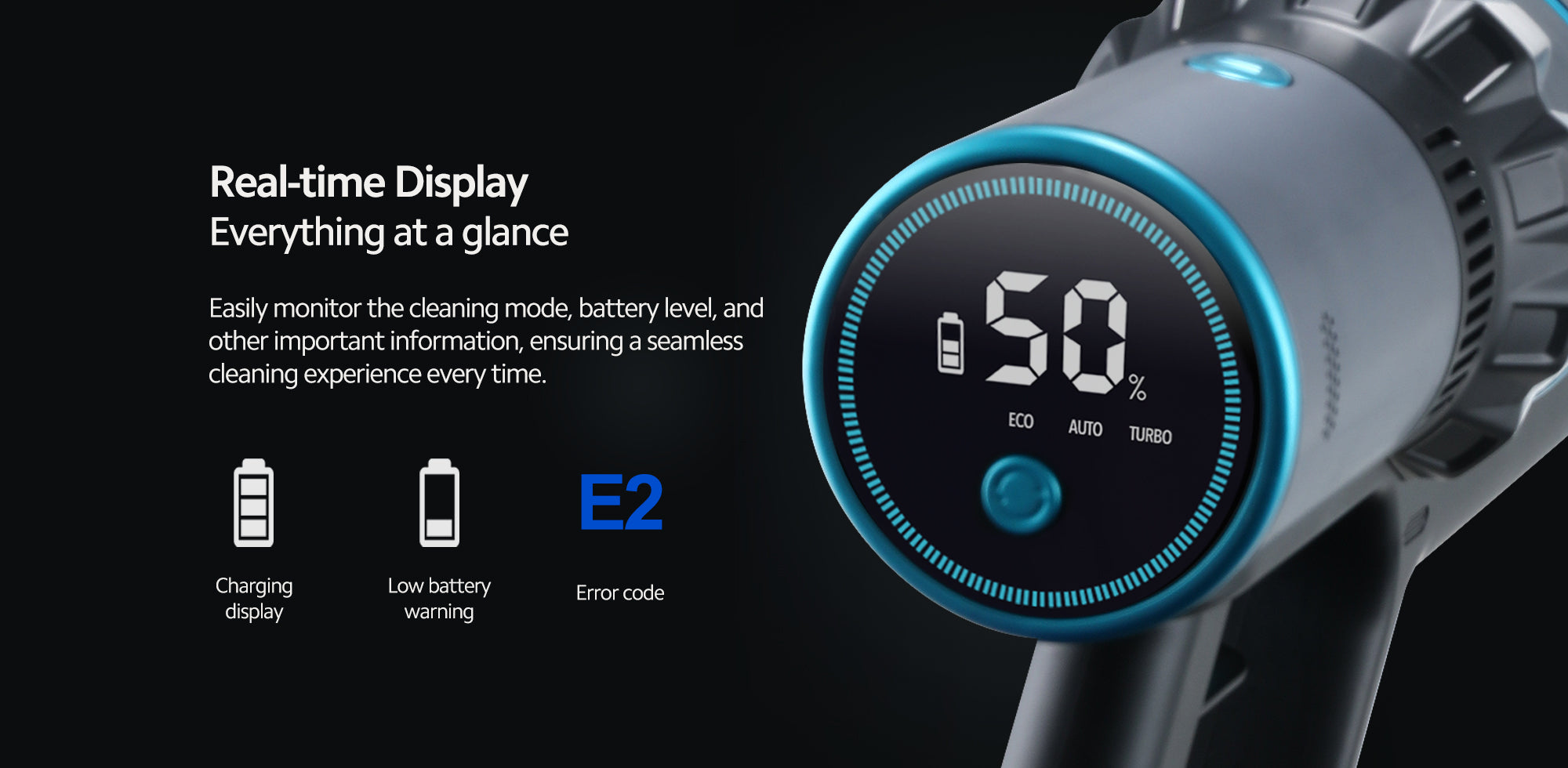 Power Mode – 3 adjustable suction power mode (Eco, Turbo, Max) that cater for all floor types to suit your needs. An intuitive LED screen panel indicates real-time power level and cleaning status.