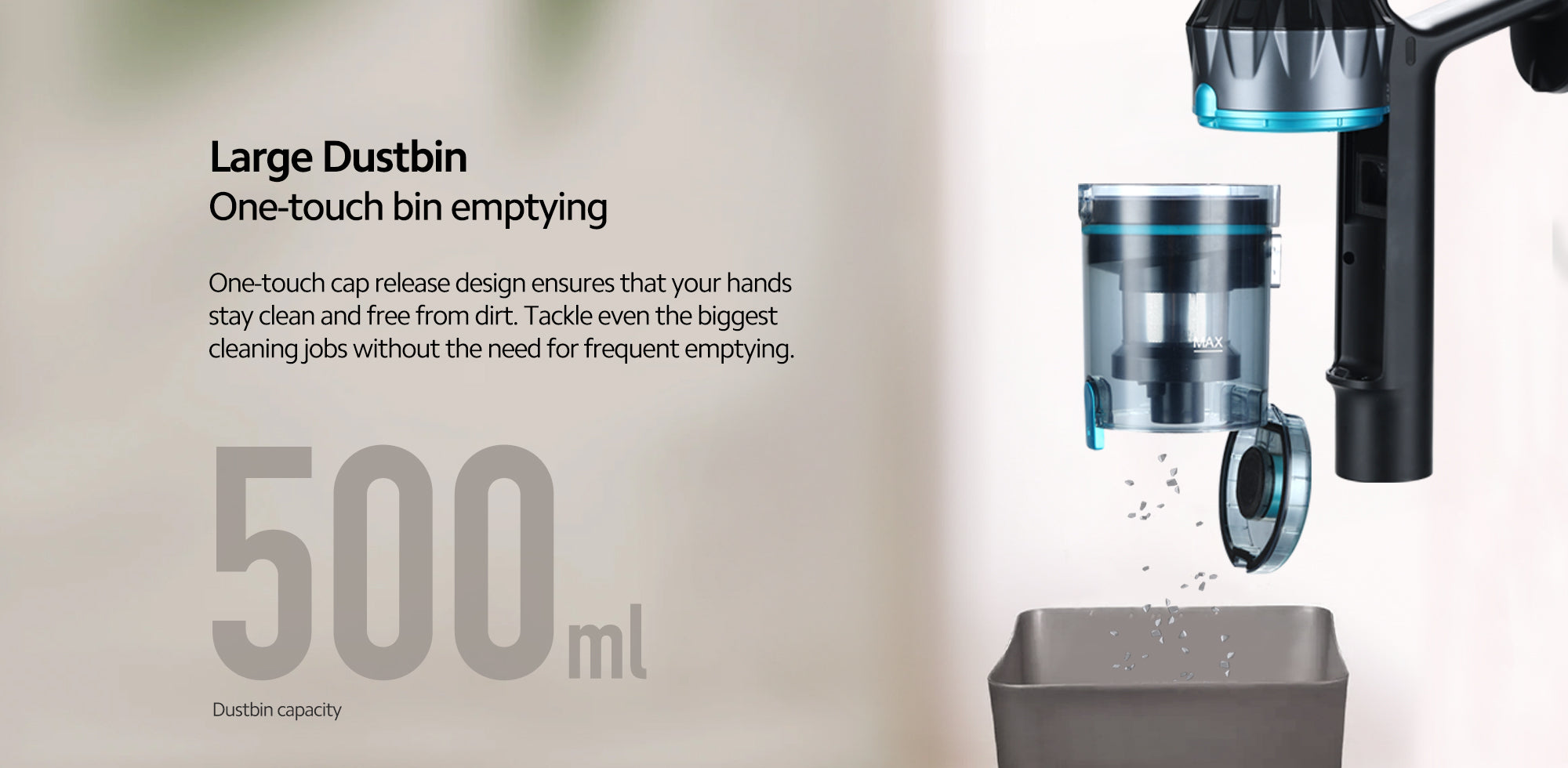 Dustbin Capacity and Filtration System – 0.5L size dustbin and H13 Medical grade Hepa 13+ Filtration System effectively clean all corners, traps all dirt, fine dust, hairs, fur and particles up to 0.3 microns in size. Nothing can escape!